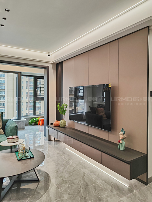 電視背景墻采用護(hù)墻板+隔柵板搭配懸浮電視柜,盡顯時(shí)尚感。