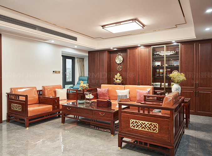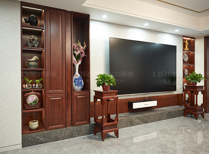 電視背景墻選擇大理石紋路木飾面,搭配開放格和格柵板,整體和諧統(tǒng)一又大氣。