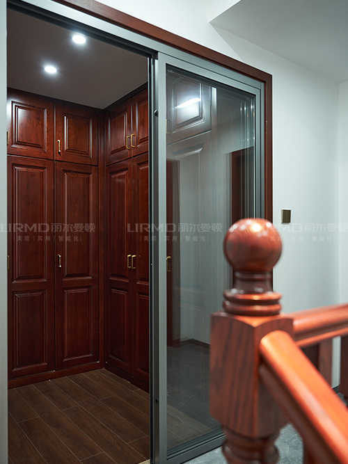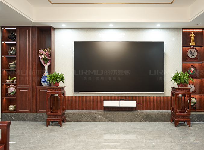 超大開間客廳背景墻用來做裝飾柜,玻璃門內(nèi)嵌燈帶穿插格柵板設(shè)計(jì),高級感一下就出來了。