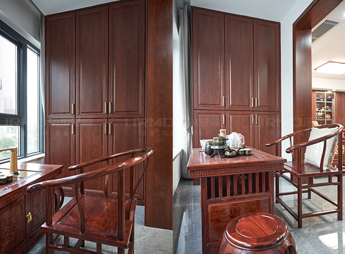 一整墻餐邊柜,中間臺(tái)面預(yù)留了插座,可放置一些小家電,玻璃柜門放茶具和瓷器等裝飾,