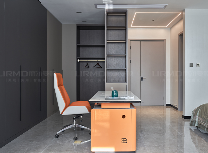 開放式書桌選用橙色椅子點(diǎn)綴,在視覺上體現(xiàn)了整個(gè)空間的層次感。