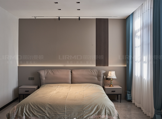床頭背景墻選用膚感格柵,吊頂無主燈設(shè)計(jì),