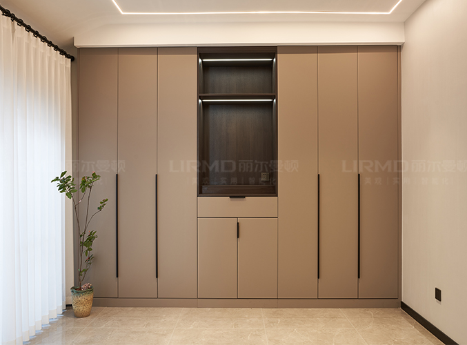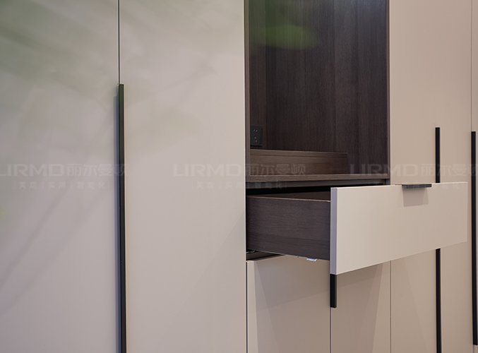 柜門選用膚感PET一門到頂設(shè)計(jì),搭配開放格+抽屜柜