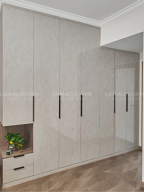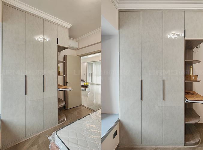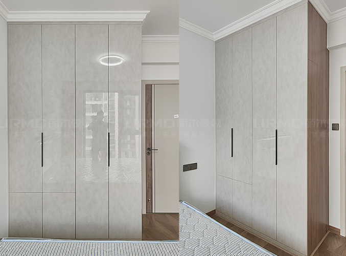 臥室選用一門到頂設(shè)計(jì)收納空間超大,右側(cè)加入分割式柜體擺放書物何一些其它物品,