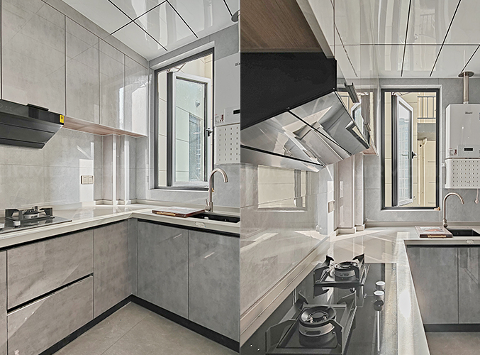 立面簡(jiǎn)致,紋理細(xì)膩,增加了瓷磚防油漆,上方有餐柜,視覺層次更加豐富,