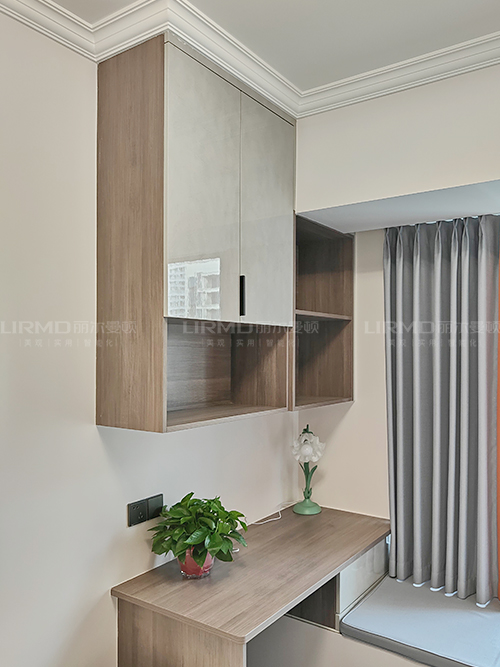 功能房大書桌,上方做整排吊柜及書柜儲(chǔ)物柜于一體。