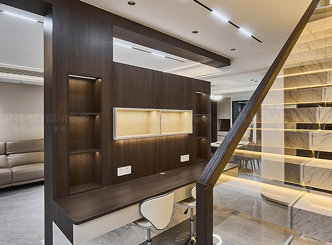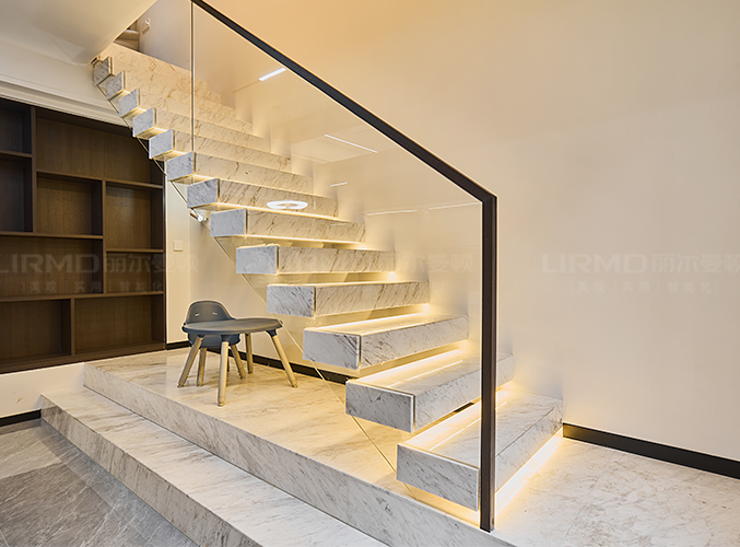 單邊懸浮樓梯,隱藏?zé)魩г黾訉哟胃?,在視覺上起到了懸浮效果,搭配玻璃護欄,