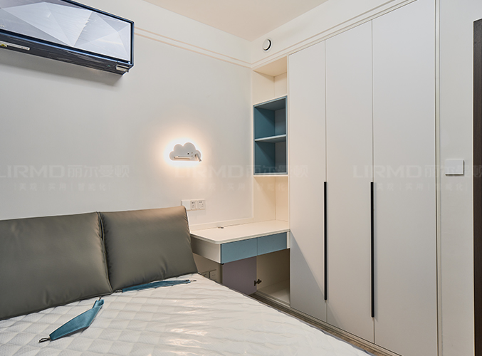 衣柜+收納柜+書桌柜,多組定制柜設(shè)計更是實現(xiàn)收納需求,精致感與舒適度拿捏的恰到好處~