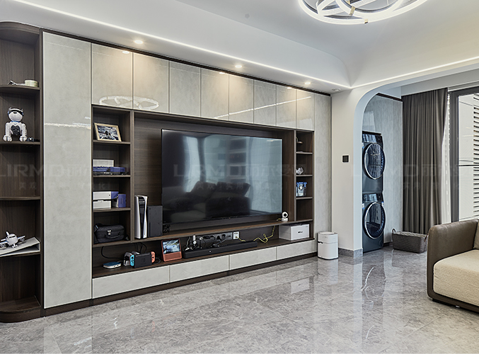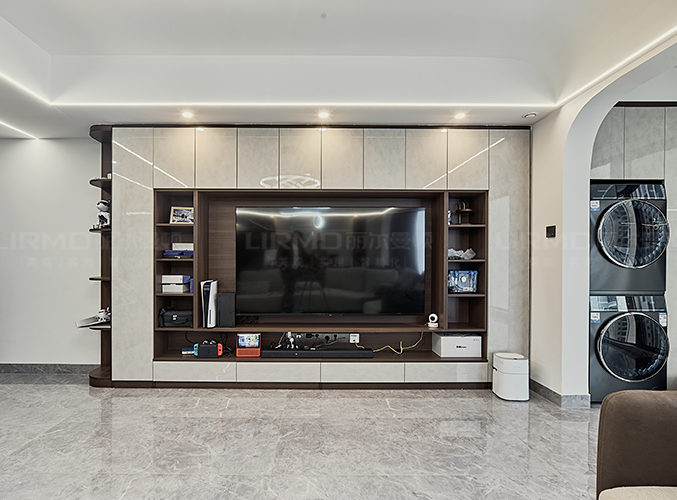 洗衣機(jī)一體柜,將洗衣機(jī)、烘干機(jī)疊放隱藏在柜體當(dāng)中,不顯突兀