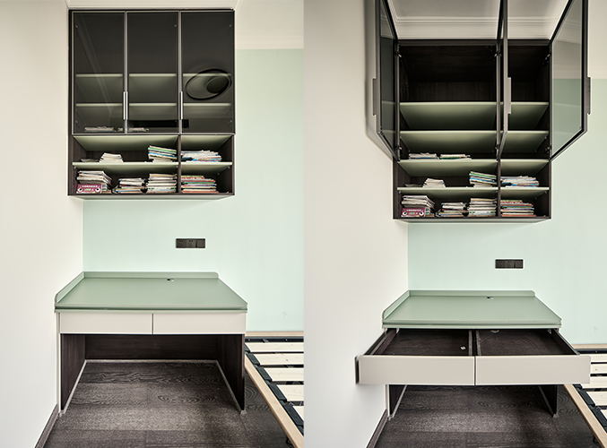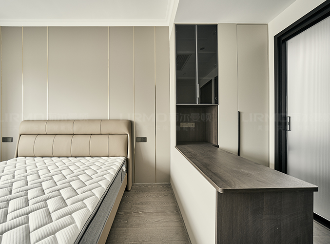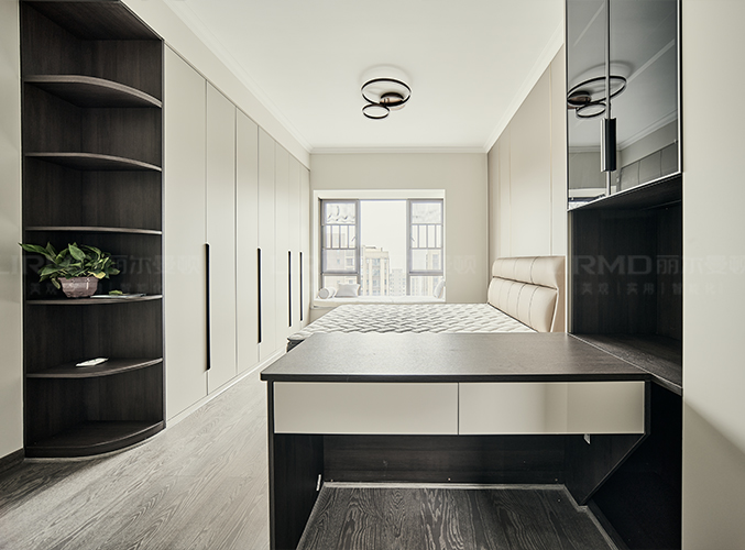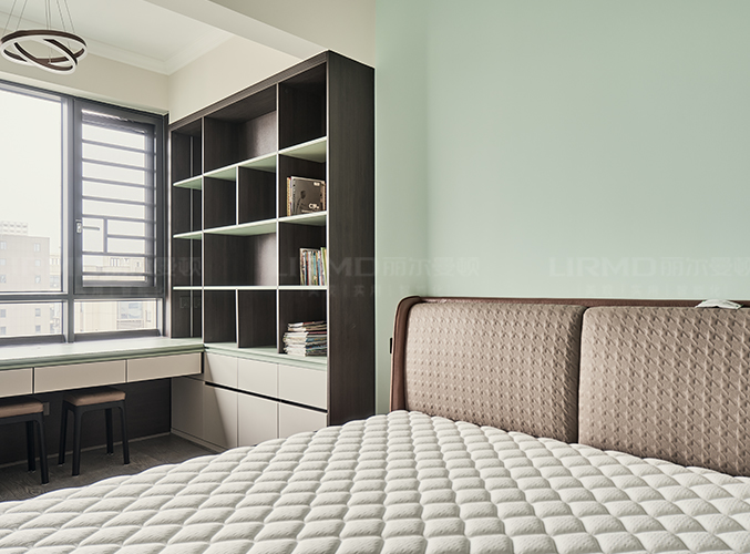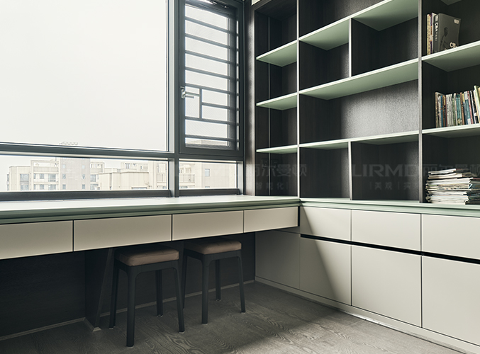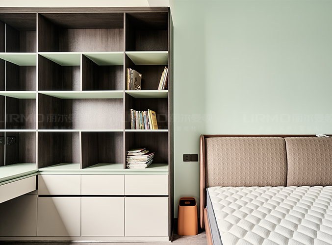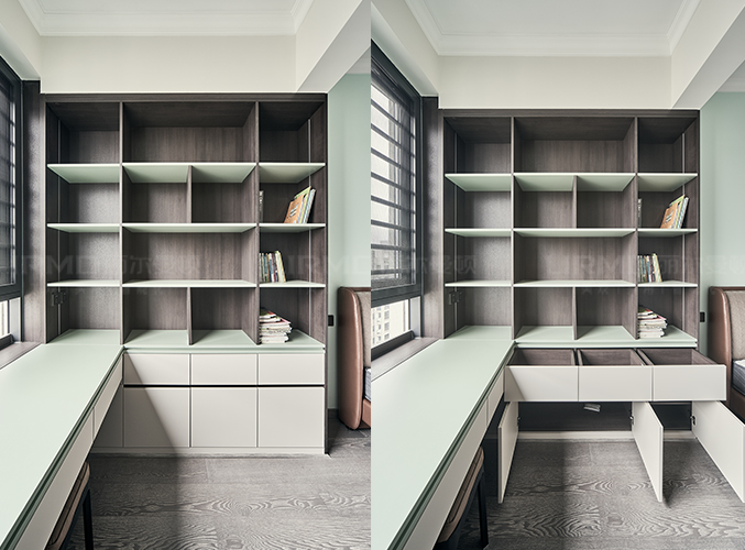 多組柜子設(shè)計(jì),實(shí)木柜體搭配PET膚感柜門,收納更方便,書(shū)柜加書(shū)桌的設(shè)計(jì),