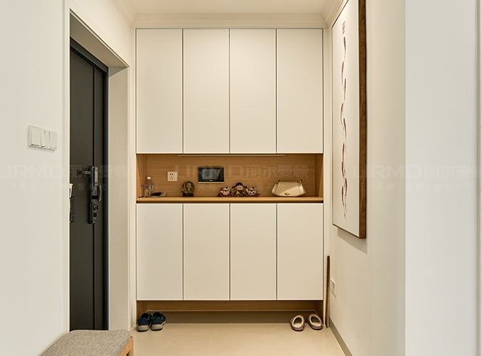 18mm厚杉木芯板,實(shí)木柜體搭配PET膚感柜門,可作為鞋柜/衣柜/收納區(qū),