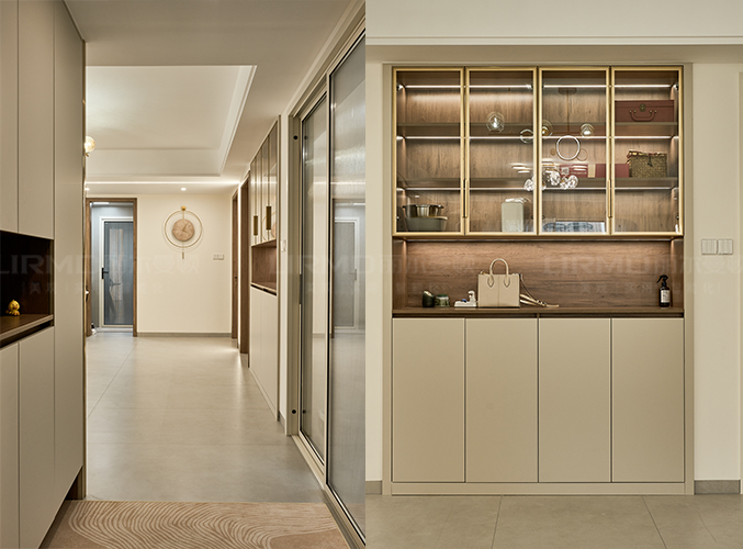 18mm厚杉木芯板,實木柜體搭配PET膚感柜門,下方懸空設計,好放置鞋子,中間內(nèi)嵌設計,