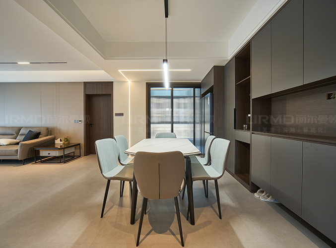 餐廳做同款餐邊柜,入戶收納+飲水機+冰箱實現(xiàn)多功能化,中間預(yù)留管線設(shè)計,下方懸空設(shè)計,