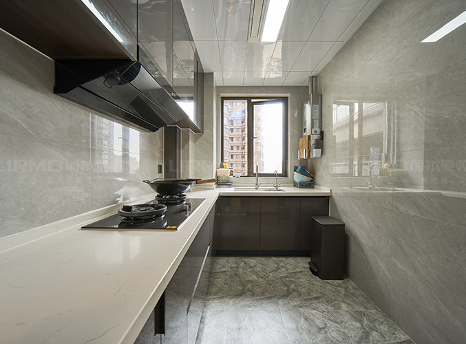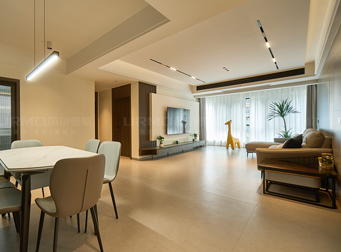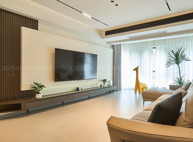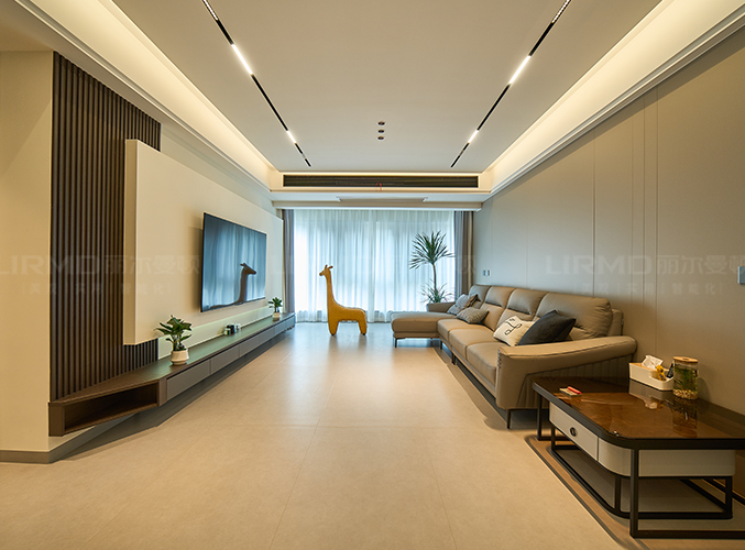整墻做電視背景懸浮柜,整體灰色系基調(diào)搭配無主燈設(shè)計,線性燈帶營造滿滿高級感。