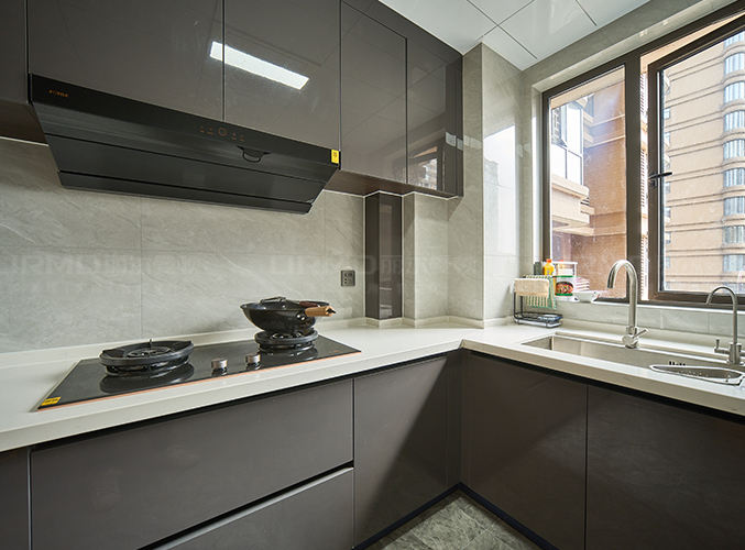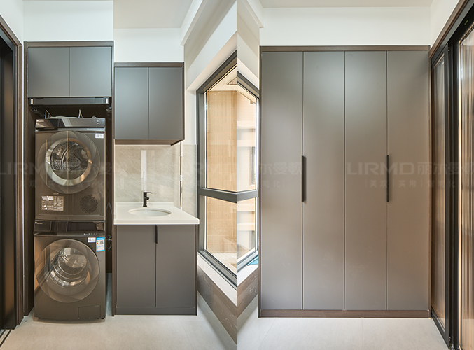 陽臺洗烘干一體化組合柜,深灰膚感飾面柜門質(zhì)感十足。