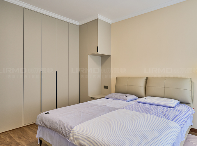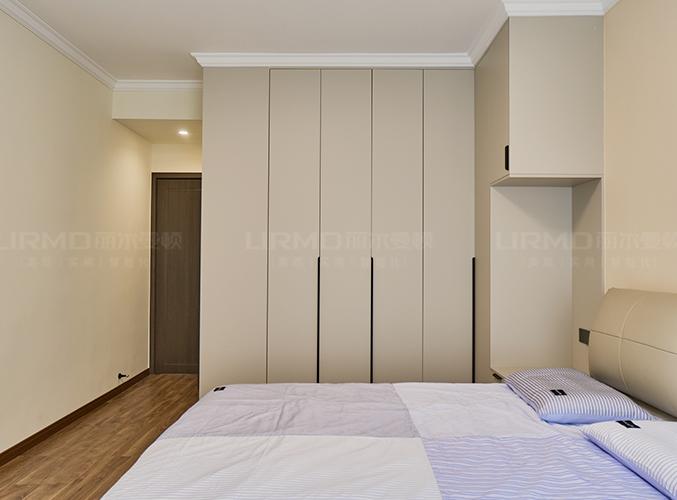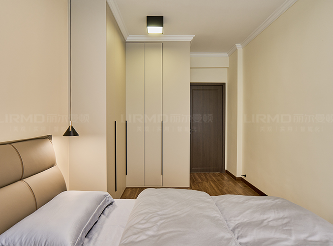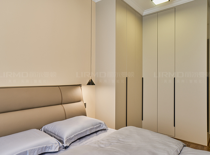 柜子一門(mén)到頂設(shè)計(jì),實(shí)木柜體搭配PET膚感柜門(mén),床邊搭配暖色系吊燈,