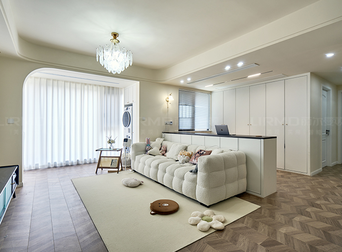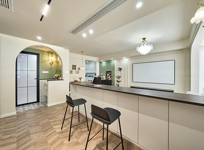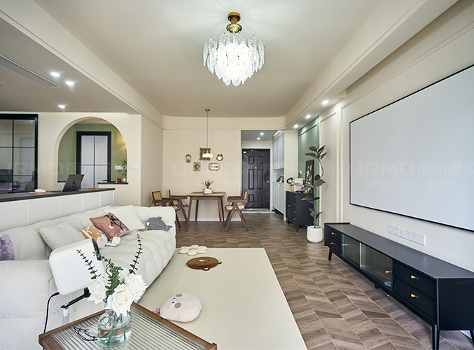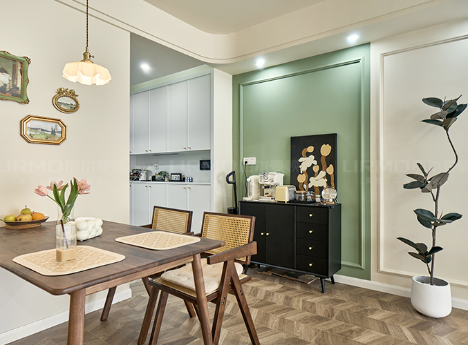 整體奶油色墻漆搭配橄欖綠,地面拼接魚骨木地板,營造清新舒適氛圍,吊燈設(shè)計,
