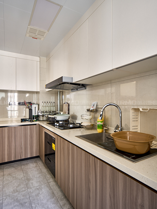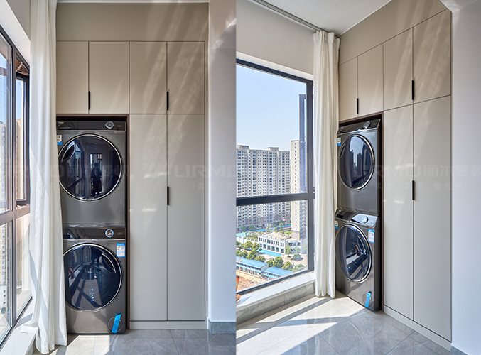 陽臺(tái)洗衣機(jī)一體柜,側(cè)面做收納區(qū),可以提前預(yù)留洗衣機(jī)和烘干機(jī)位置。