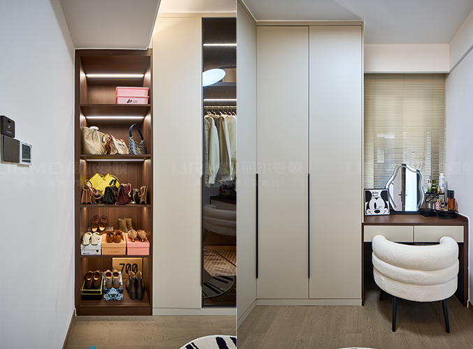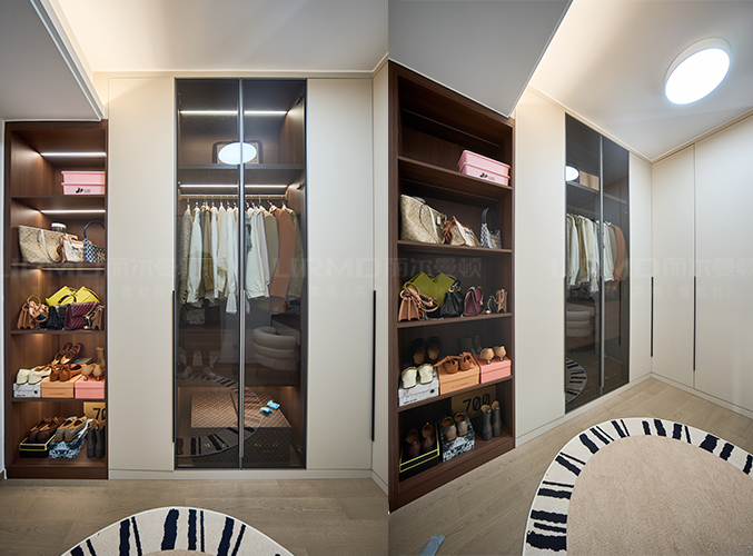 衣帽間分為三個(gè)區(qū)域,梳妝區(qū)、掛衣區(qū)、包包區(qū)、搭配玻璃柜門,更加時(shí)尚。