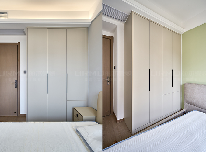 臥室衣柜和墻漆搭配盡顯高級(jí),三葉門衣柜,床頭位置做分段柜門,讓空間合理利用。