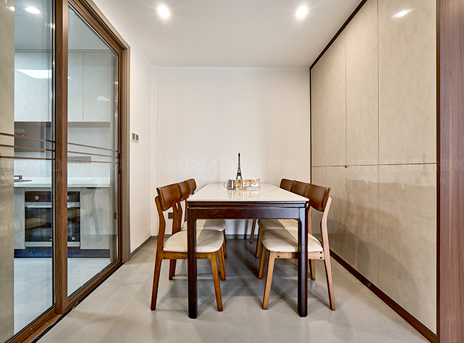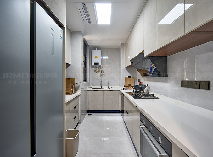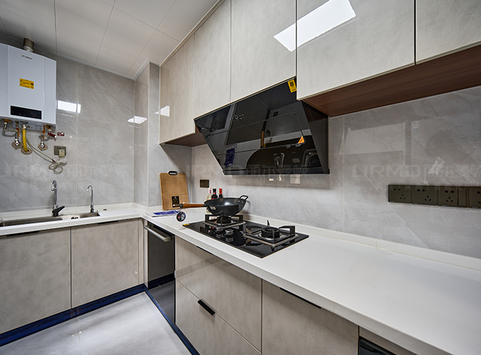 上下方都有收納柜,視覺層次更加豐富,搭配大理石臺(tái)面美觀又實(shí)用,內(nèi)嵌式冰箱設(shè)計(jì),不占空間。