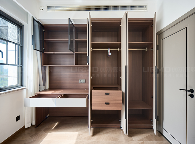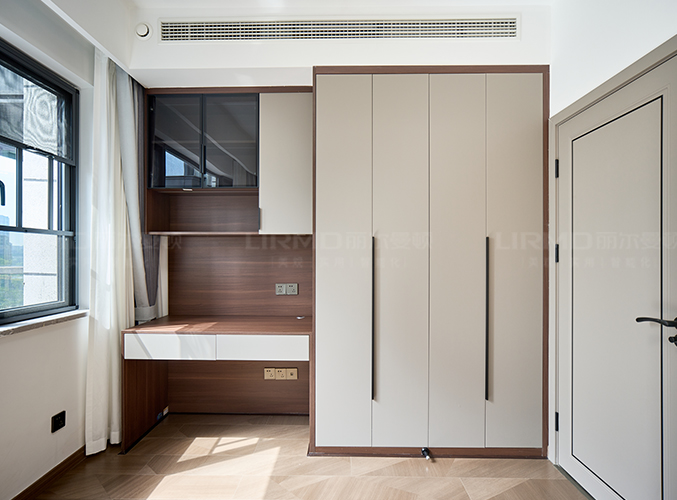 滿墻衣柜+同色系背景墻,超大陽臺(tái)放置梳妝臺(tái)采光一流,衣柜+書桌一體設(shè)計(jì),儲(chǔ)物學(xué)習(xí)更方便。