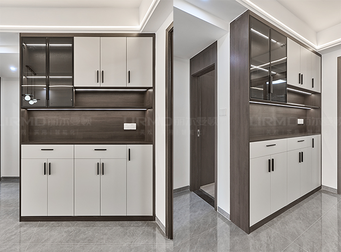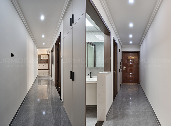 入戶是一條很長的走道,玄關位置做開放格設計,下方懸空設計,好放置鞋子,