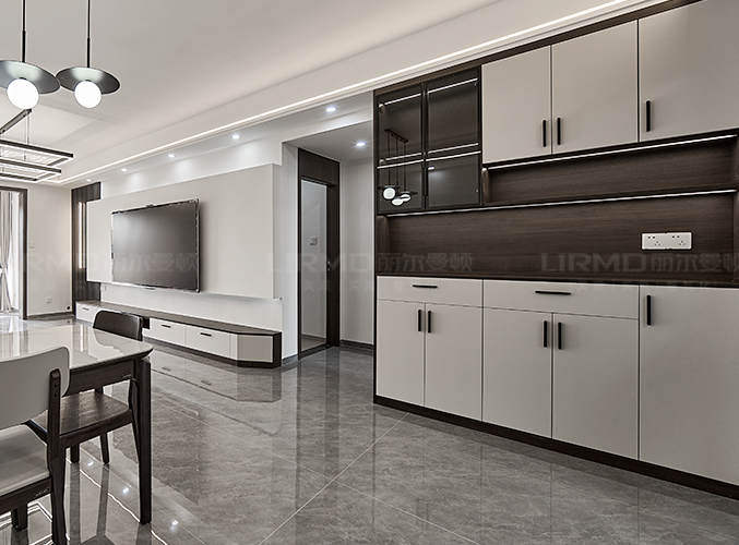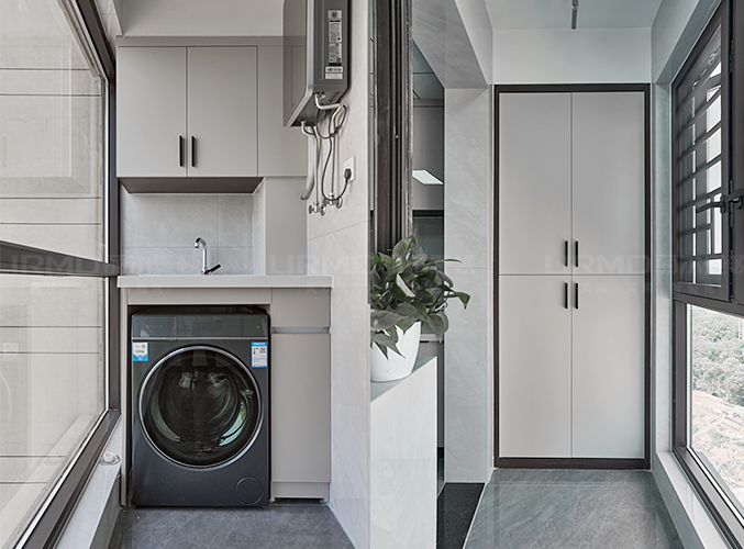 象牙灰柜門搭配煙熏尤加利柜體,整體不失單調,中間部分做雙層設計,