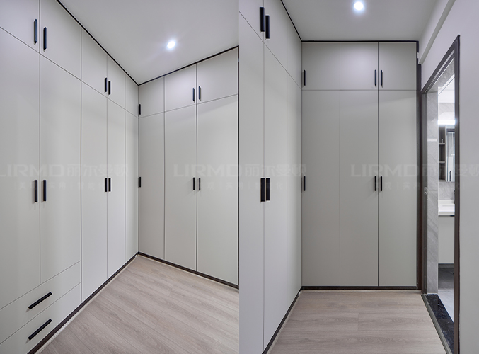 主臥兩側定制床頭柜,柜體延伸至頂端,充分利用空間,側面做一個L型的衣帽間,