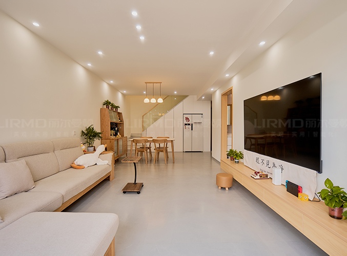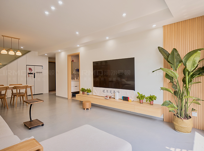 電視背景懸浮柜設(shè)計(jì),整塊墻做電視背景墻,盡顯大氣,無主燈設(shè)計(jì)搭配大白墻,