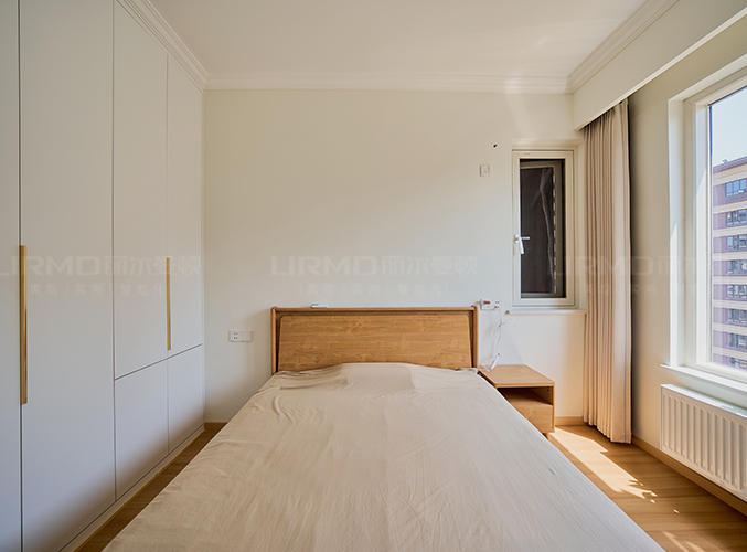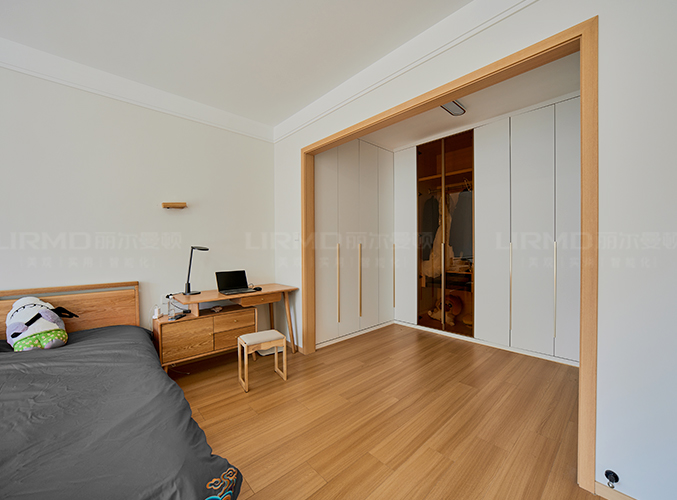 臥室整體原木+奶白,實(shí)木柜體搭配PET膚感柜門,一門到頂,質(zhì)感超不錯(cuò),