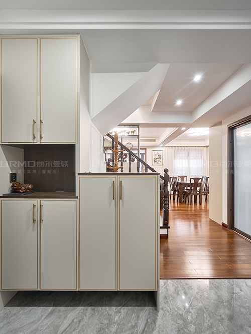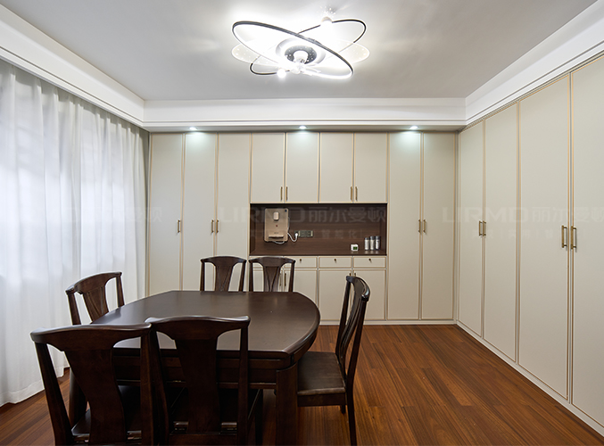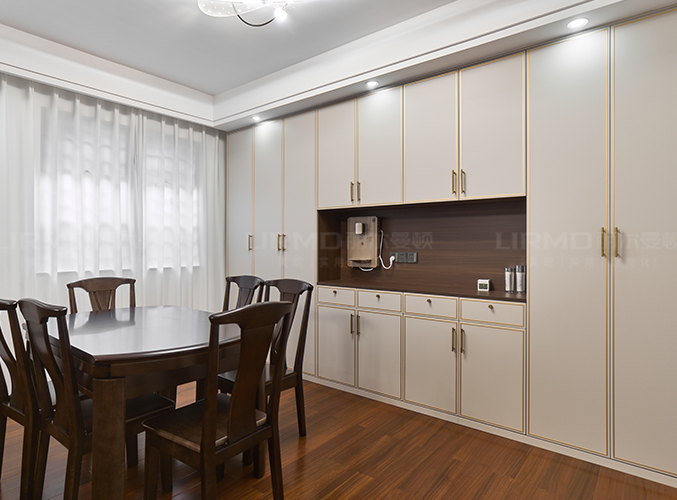 餐廳整墻做餐邊柜,白色柜門鑲嵌金屬邊框,分段造型柜門設(shè)計(jì)僅限優(yōu)雅檔次。