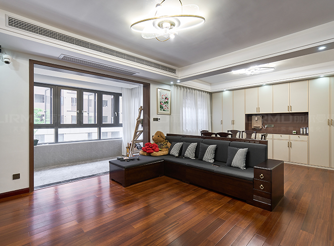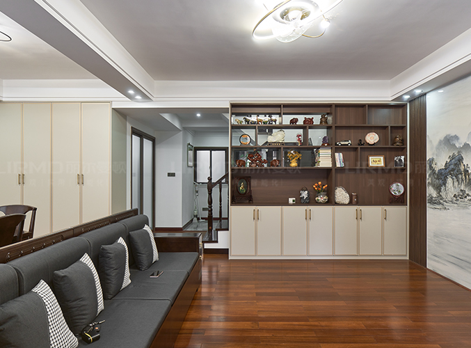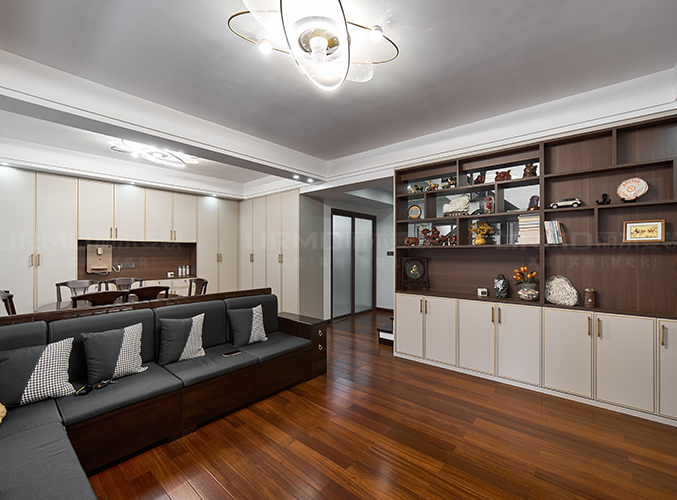 客廳鋪設(shè)木地板搭配山水畫電視墻,吊燈設(shè)計(jì),增強(qiáng)照明實(shí)用性的同時(shí)又增貼了空間藝術(shù)感。