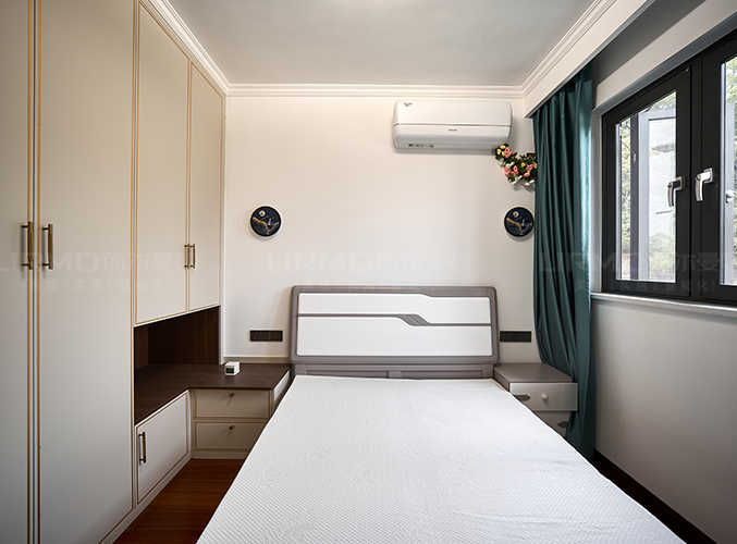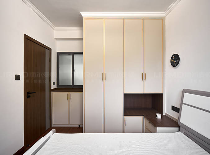 臥室同款造型衣柜,門墻柜一體化,衣柜開放格延伸做床頭柜,整體統(tǒng)一。