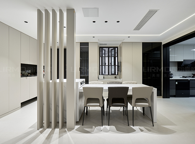餐廳整墻做餐邊柜,島臺(tái)餐桌一體,可推拉調(diào)節(jié)餐桌長(zhǎng)度,滿足多人聚餐需求。