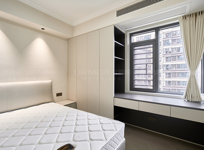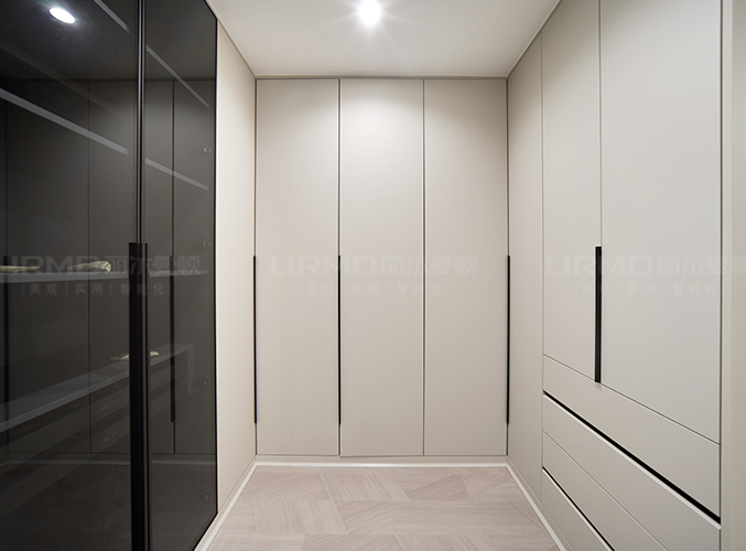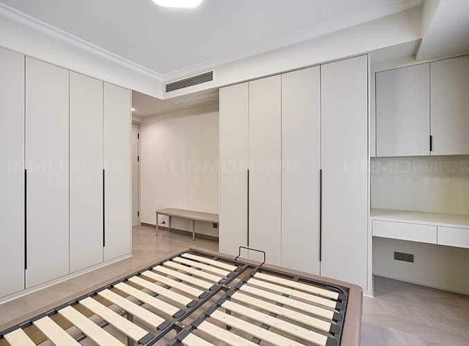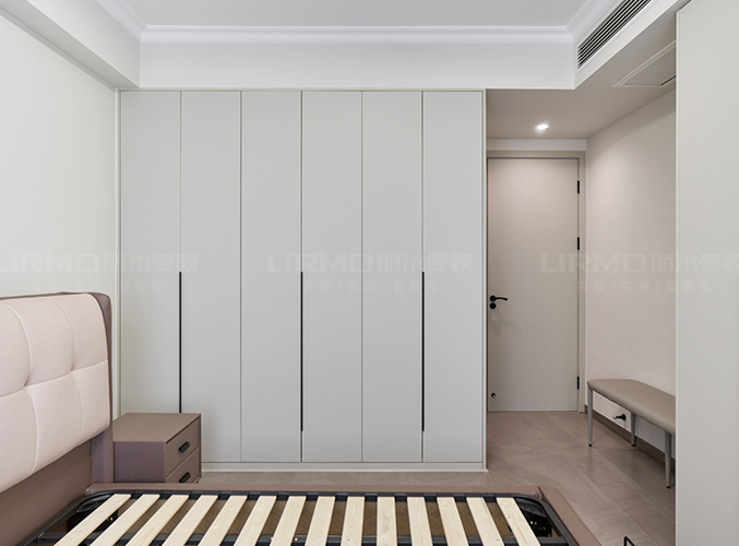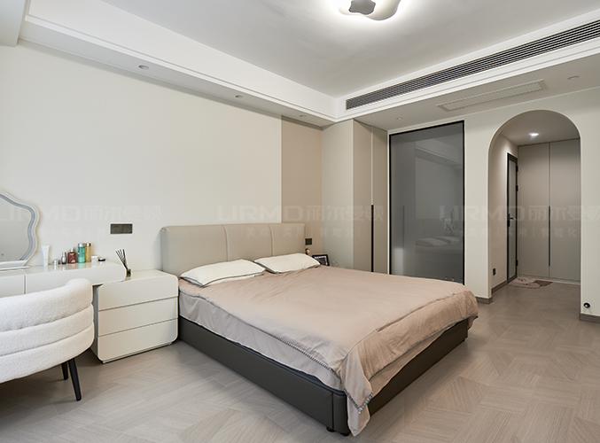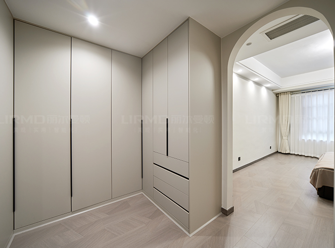 臥室拱形門(mén)分割衣帽間,滿墻衣柜實(shí)現(xiàn)門(mén)墻柜一體化,整體統(tǒng)一高級(jí)。