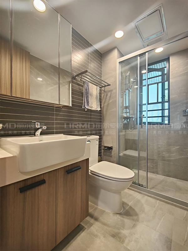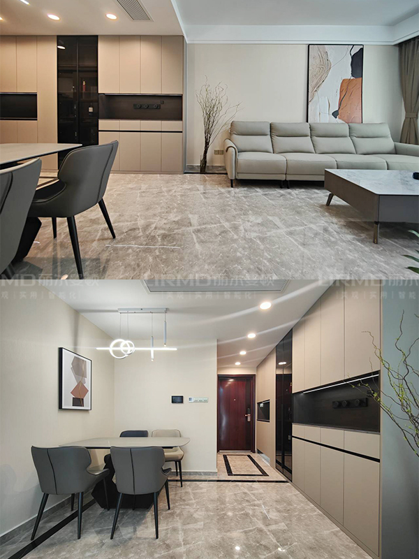 馬可波羅大板磚、箭牌衛(wèi)浴、圣象地板、以及與全房定制衣柜同款同色同造型的定制房門和鋁合金門、恒潔潔具等