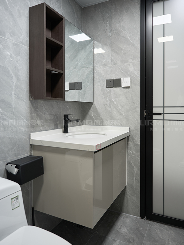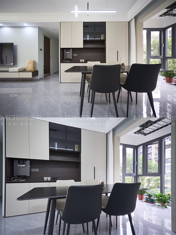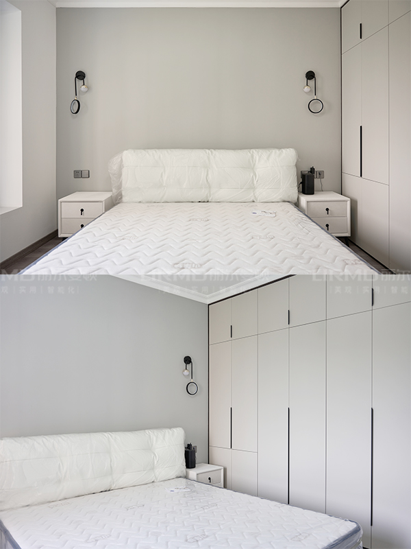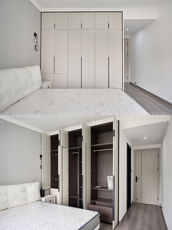 全房共定制了10個(gè)柜子,柜體采用足18厚杉木芯板,柜門采用LSB板PET膚感柜門,一門到頂,五金使用原裝進(jìn)口的百隆五金