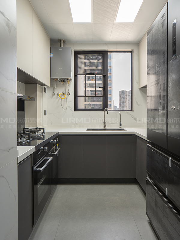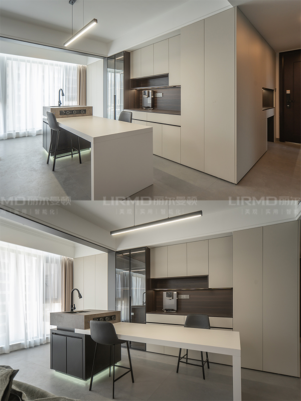 超長(zhǎng)到頂餐邊柜、陽(yáng)臺(tái)儲(chǔ)物柜、陽(yáng)臺(tái)家政柜、西廚區(qū)中島臺(tái)、中廚區(qū)u型櫥柜、