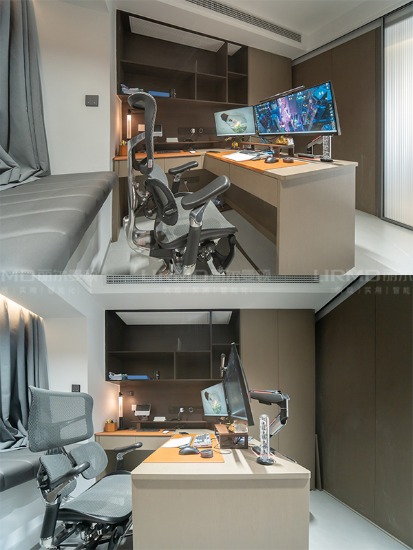 全房柜子是玻璃柜門與木制柜門相結(jié)合,既通透又顯高級,搭配各種手辦設(shè)計(jì)感滿滿