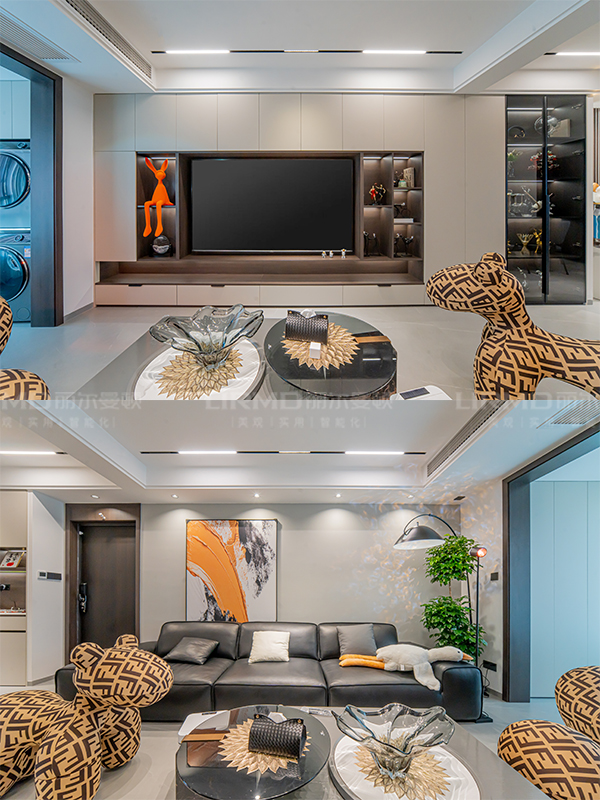 空間色調(diào)整和諧體統(tǒng)一,主要黑白灰三個色調(diào)為主基調(diào),為了不使空間單調(diào)深沉,增加撞色處理,