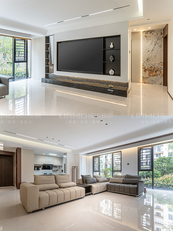 采用無主燈設(shè)計,開放式廚房,全房大磚通鋪。
