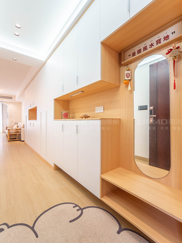 入戶衣帽間設(shè)計(jì)了換鞋凳、掛衣區(qū)、入戶鞋柜,并與餐邊柜做一體式設(shè)計(jì),簡(jiǎn)潔又大氣??
