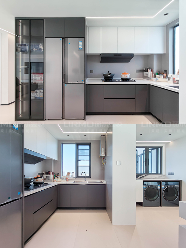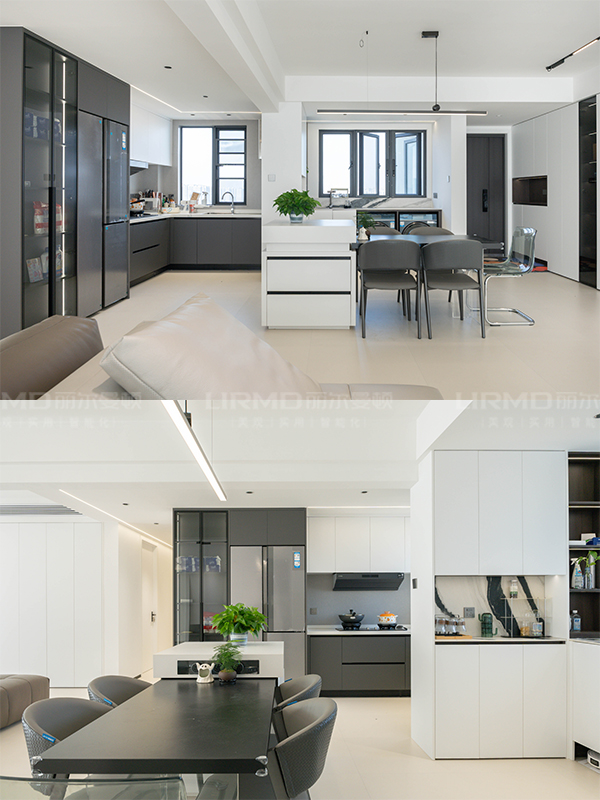客餐廳、陽(yáng)臺(tái)、廚房、書(shū)房四合一設(shè)計(jì),高效利用收納空間。