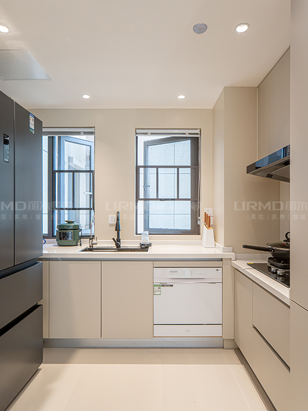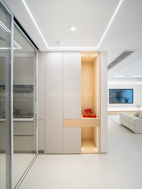 廚房改成半開放式設(shè)計(jì),連接入戶玄關(guān)設(shè)計(jì),整體更加通透、有層次感