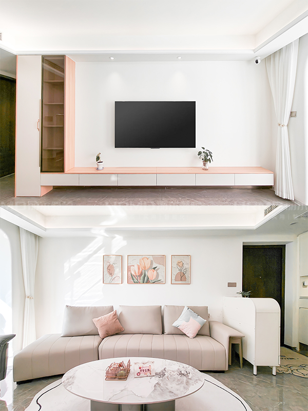 全屋通鋪 750×1500 瓷磚,明亮大氣有延伸感,L 型懸空電視柜,