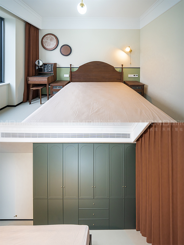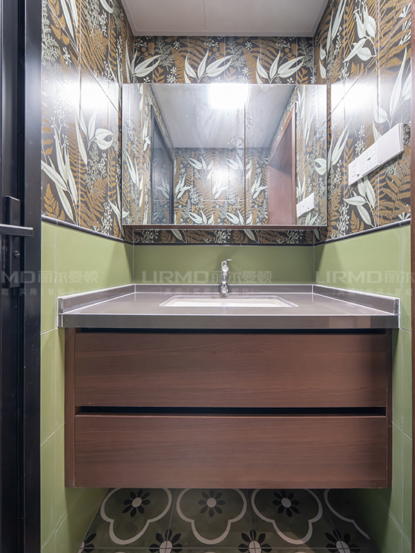 全屋用復(fù)古綠與奶咖色做撞色,融入花磚設(shè)計(jì),整體充滿故事感