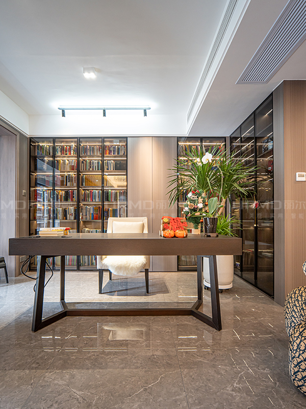房客廳一體設(shè)計(jì),空間通透明亮又舒適,整墻書柜滿滿的書香氣,辦公學(xué)習(xí)都毫無壓力