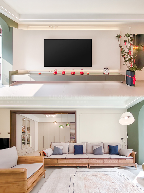 ?弧形電視柜+懸空一字柜設(shè)計(jì)不顯壓抑,營(yíng)造輕盈感