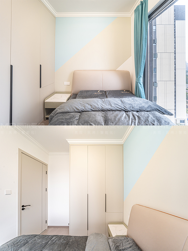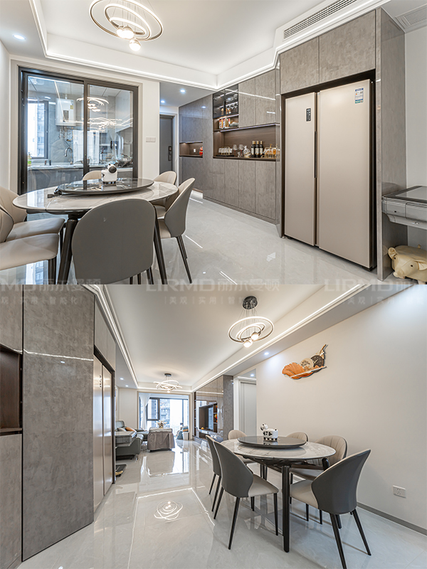 全屋門墻柜一體化,采用深石紋+深色木飾面的搭配,讓空間不沉悶又有層次感